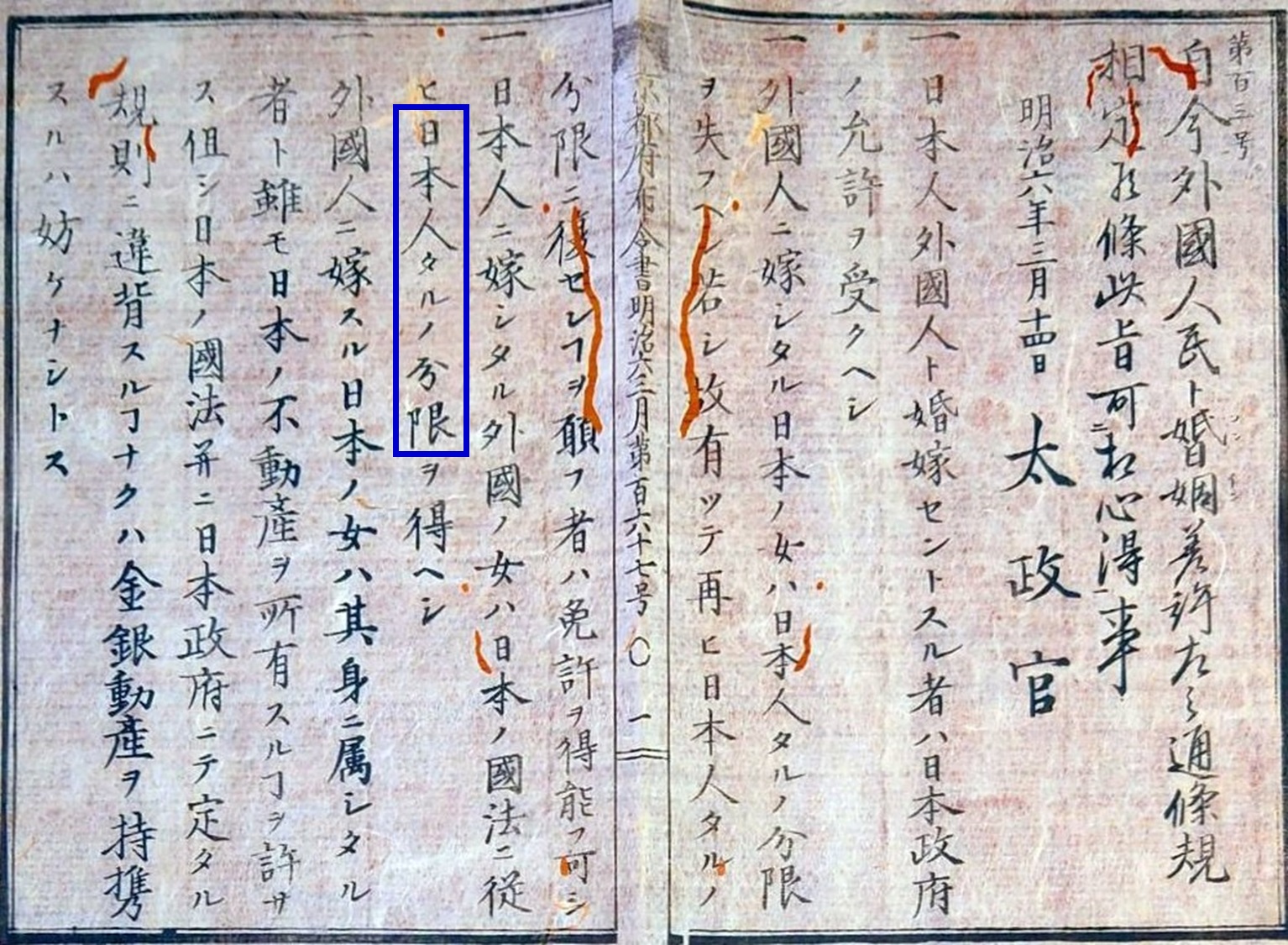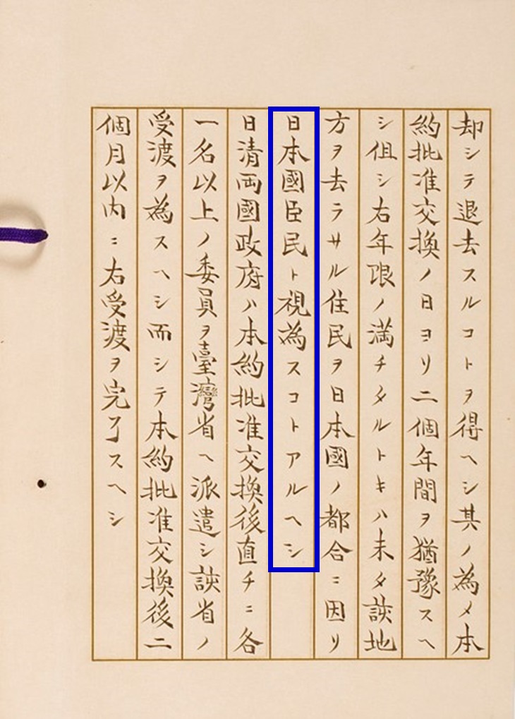 「日本国臣民ト視為スコトアルヘシ」(青色の枠)