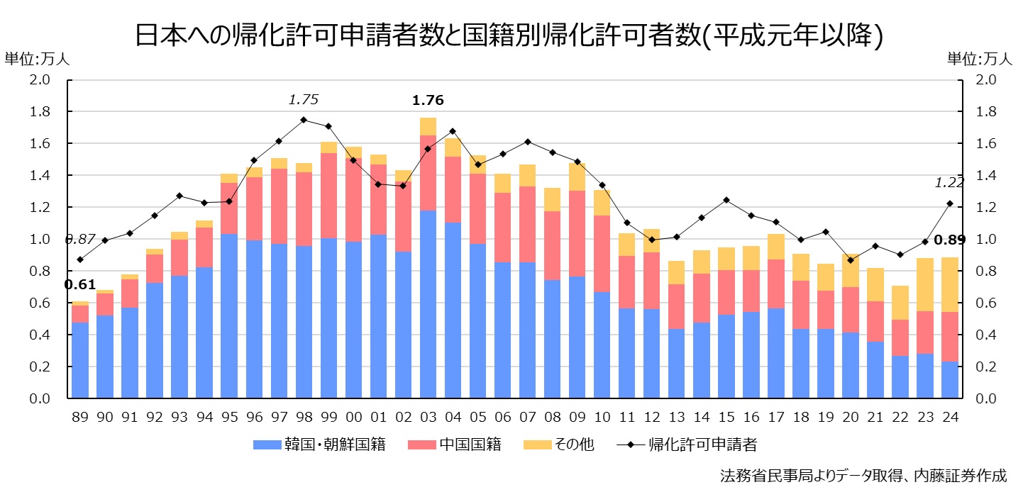 2000年代は中国や韓国の経済発展を背景に、日本への帰化申請者と帰化許可者がそろって減少