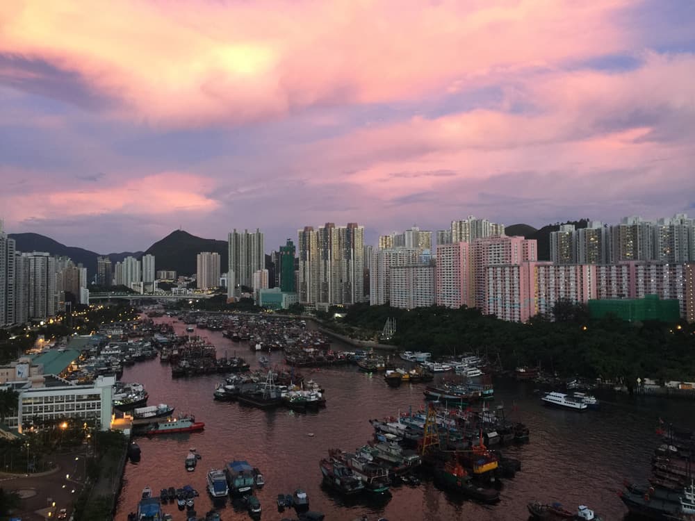 対岸の島との間の狭い海に蛋民の小船が並ぶ