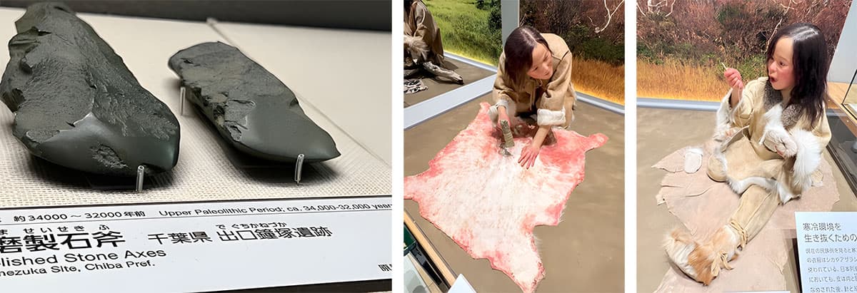 この写真は旧石器時代の資料だが、左の磨製石斧は、石とはいいながら、磨き上げたsharpな先端部はいかにも切れ味が良さそうだ。これを柄に装着して木を切り、獣を仕留めていたのかと思うと、縄文の男のアドレナリンがこちらにも伝わってくる。右の2枚の写真は、狩り獲った動物の皮をなめし、衣服を縫う女性の親子だが、旧石器時代の展示物だと知らない人に、現代のアラスカの情景だといってもおかしくないほど今の我々と変わらない。もちろん国立歴史民族博物館の研究者たち、造形作家たちが苦労しながら検証して作り上げた想像上のダミーだが、実に真を写していると感じられる、優れた復元物だと感心した。