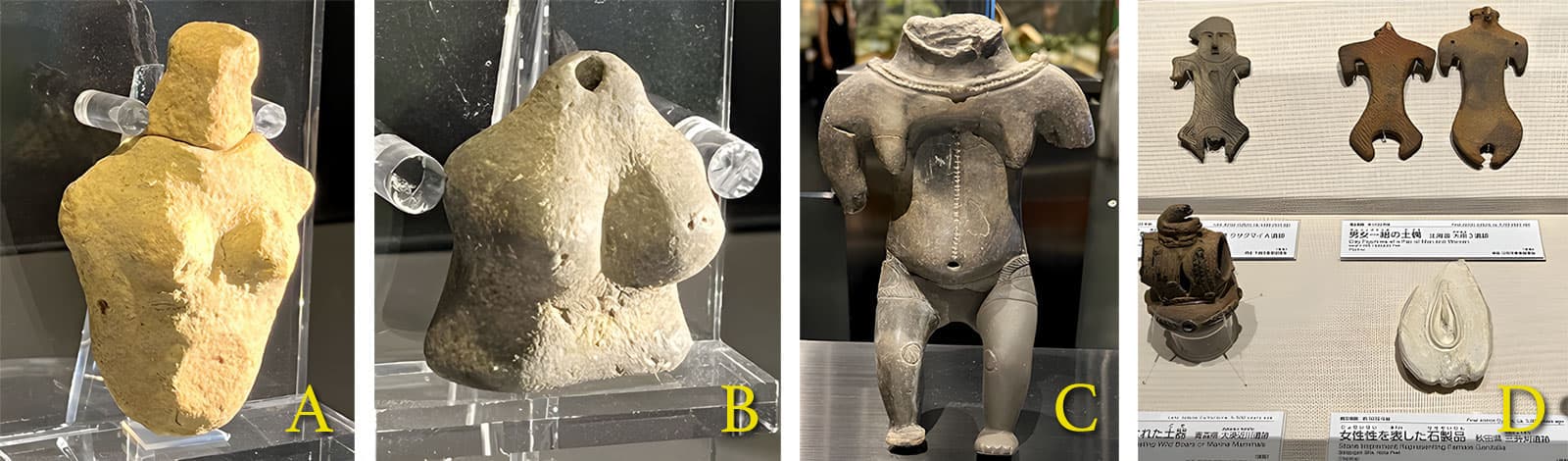 国立歴史民俗博物館の展示をそうした観点から見てみると、以下の写真左から、第二次性徴を終えた若い女性(A)、妊娠後期で授乳可能な若い女性(B)、中年以降の経産婦女性(C)を象っていると考えられる。縄文人の表現力からすれば形を写す事は容易であるはずにも関わらず、あえてデフォルメして女性性(生、命)を崇めて神格化する意図も見える。最後の写真右下端の石偶(D)には女性器が描かれているのだが、尿道口まで解剖学的に正しい位置に作られていて、それが3000年後にNetterが描くイラストとほぼ同一のqualityを持っていることに驚嘆を覚えた。